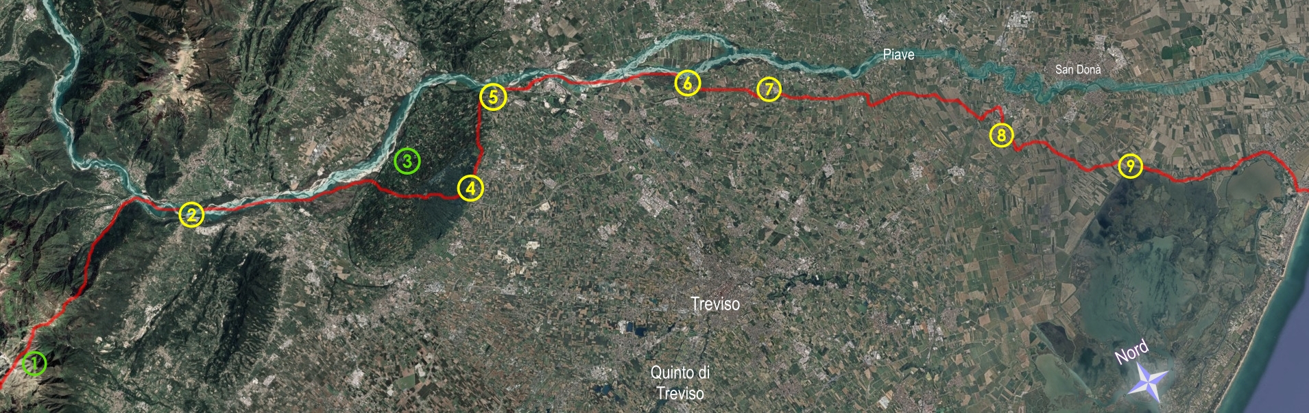 (1) Cima Grappa km 38 — (2) Pederobba km 30 — (3) Il Montello Km 22 — (4) Giavera del Montello km 16 — (5) Nervesa [della Battaglia] km 20 — (6) Salettuol km 19 — (7) Candelù Km 20 — (8) Losson Km 25 — (9) Caposile Km 31