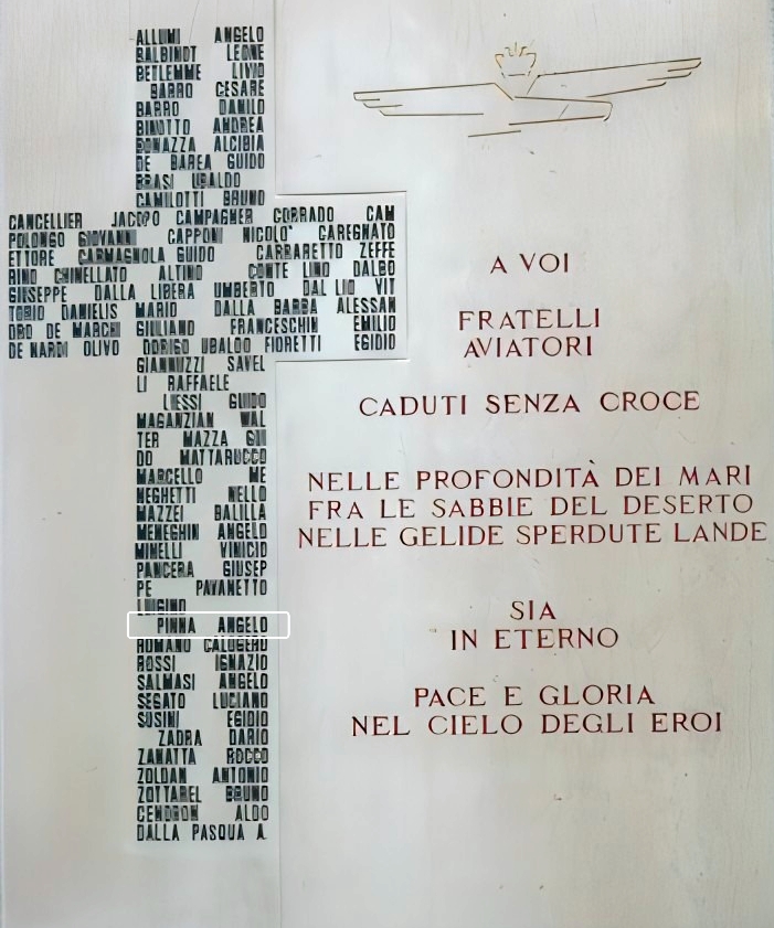 Il nome di Angelo Pinna è presente anche sulla lapide del cimitero di Treviso dedicata agli Aviatori Trevigiani dispersi in Guerra.