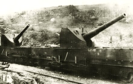 Cannoni di una batteria d'assedio del Regio Esercito approntata su carri ferroviari